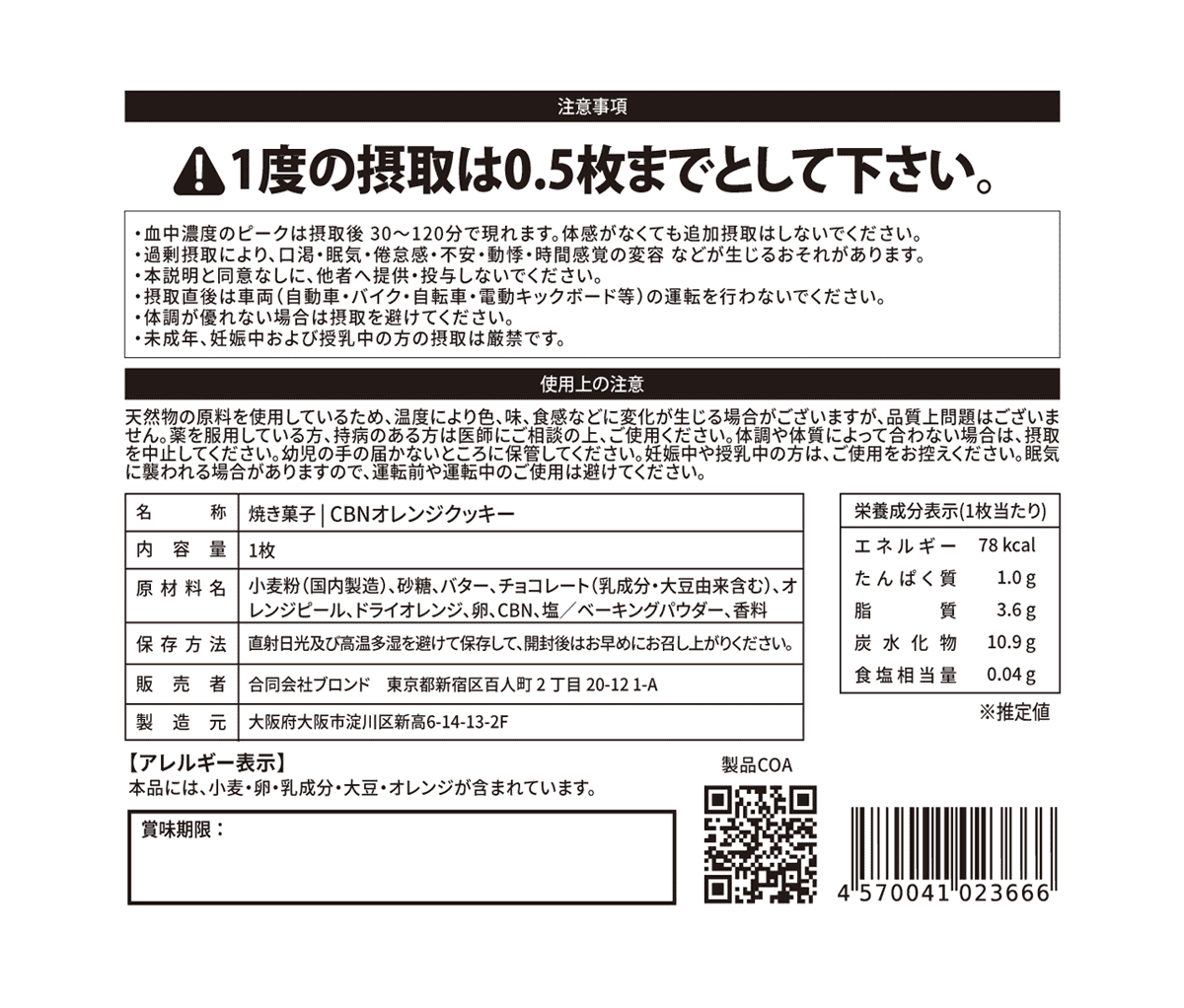 ・原材料:小麦粉(国内製造)、砂糖、バター、チョコレート(乳成分・大豆由来含む)、オレンジピール、ドライオレンジ、卵、CBN、塩、ベーキングパウダー、香料